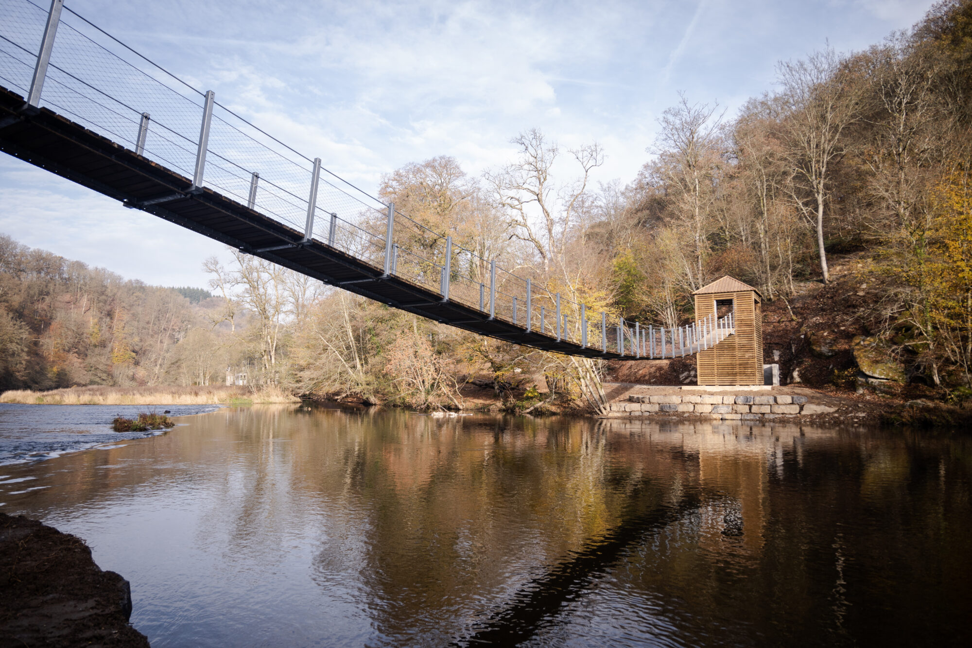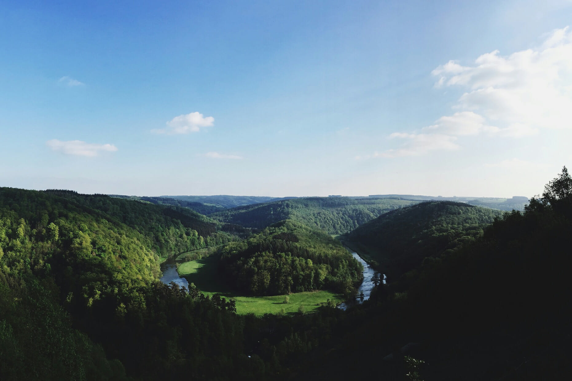 Depuis Rochehaut, la randonnée plonge rapidement dans la vallée pour rejoindre Frahan, lové dans un méandre spectaculaire de la Semois. La montée vers la crête de Frahan marque l’un des premiers temps forts : le regard porte loin, la vallée se dévoile, et la marche devient plus engagée. Le sentier se poursuit vers une succession de belvédères qui rappellent la force du relief et la verticalité du terrain. La descente vers la Semois et le passage le long de la rivière offrent un contraste saisissant avant de reprendre de la hauteur avec une vue exceptionnelle sur le château de Bouillon et la ville.